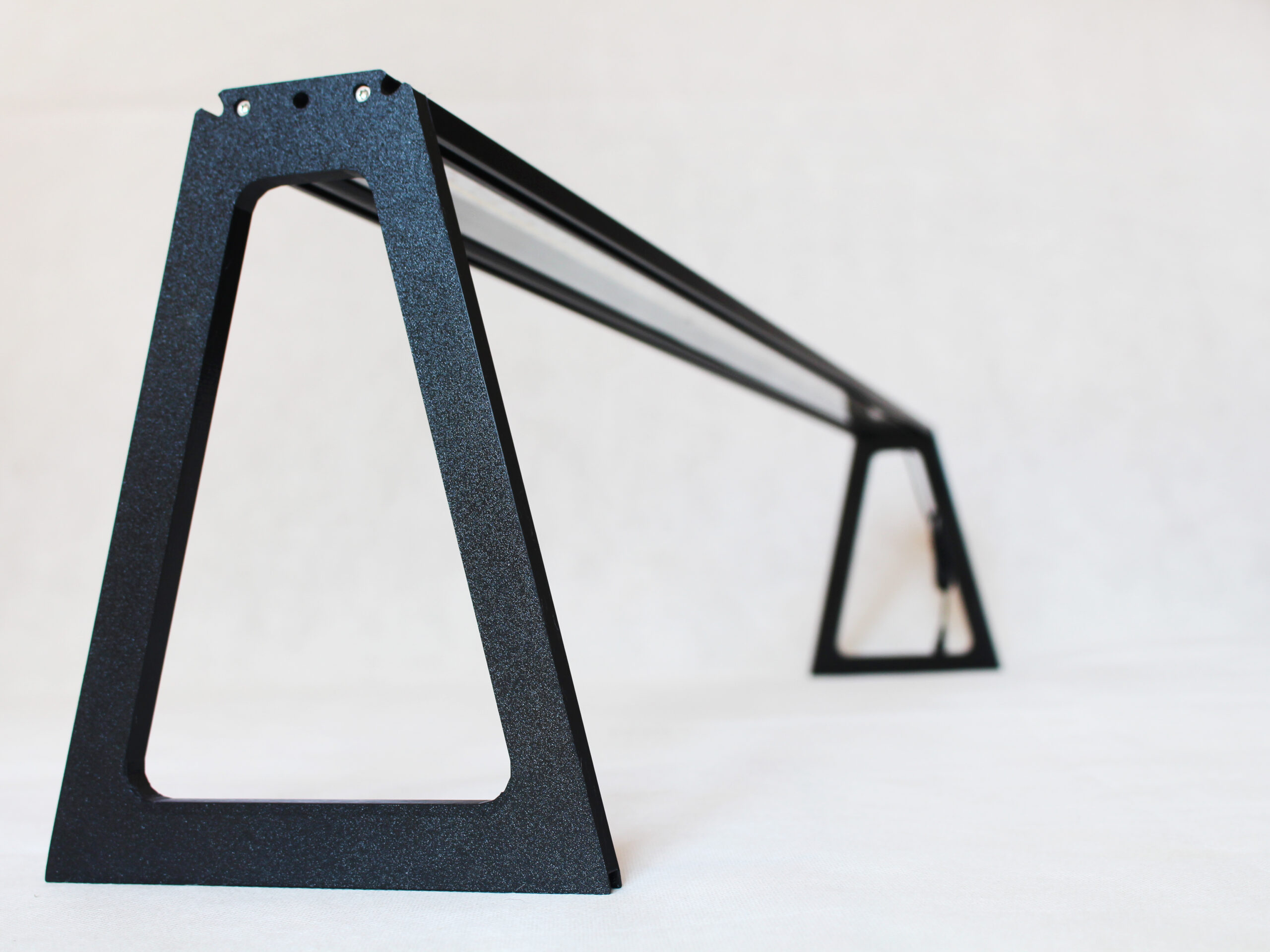 Lišta rampy je z eloxovaného hliníku, nohy pak z odolného plastu. Obojí je v černé barvě, která nerušivě zapadne do většiny interiérů. LED čipy zároveň míří kolmo dolů a okolí tak oslňují méně než zářivkové trubice.